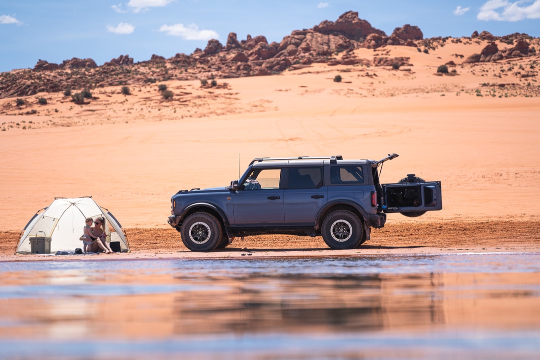 The distinctive exterior design pays homage to Ford Bronco heritage while incorporating modern functionality.