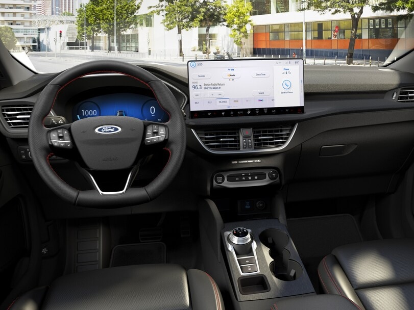 ST-Line - Sporty styling with 1.5-liter EcoBoost engine (180 horsepower), 18-inch wheels, sport heated steering wheel, partial vinyl/cloth seats with red stitching, and eight-way power driver seat